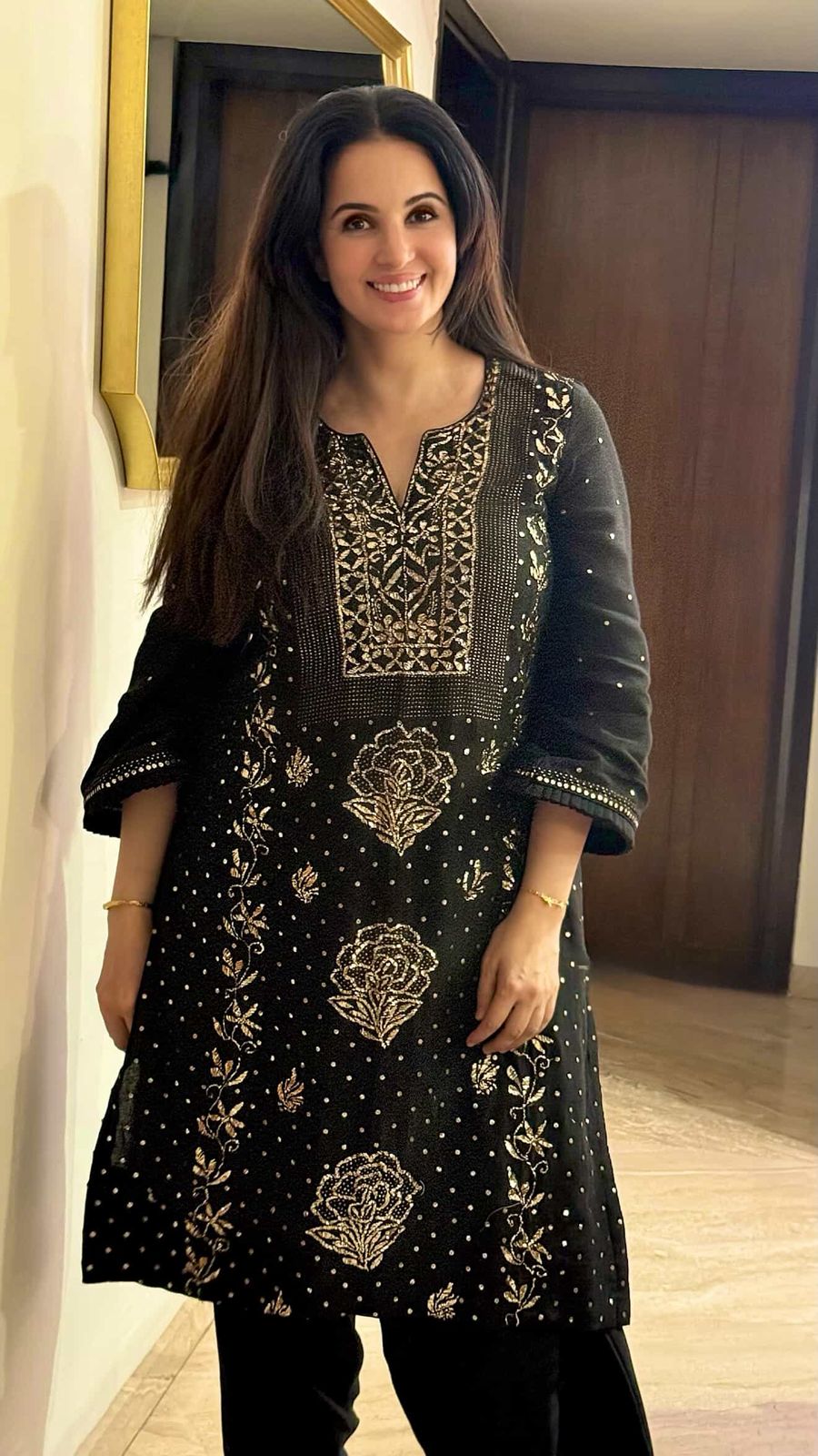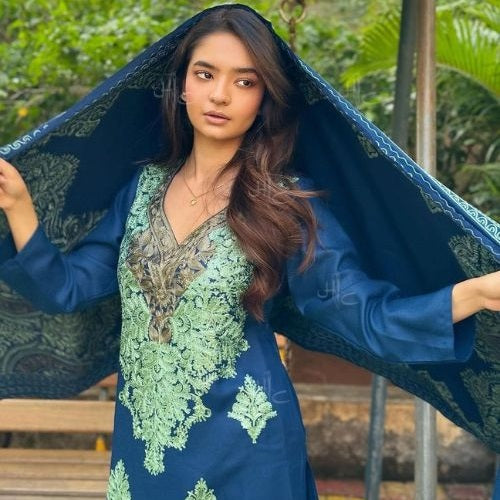 Anushka sen in Kasmira Aari Woollen Straight Kurta set with Dupatta