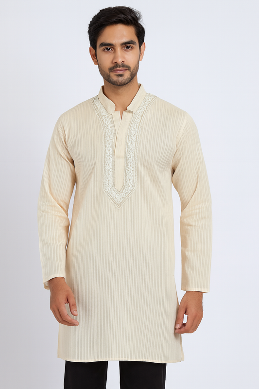 Lucknowi Chikankari Fawn 'Harnai Rang' Cotton Gents Kurta-GK00025