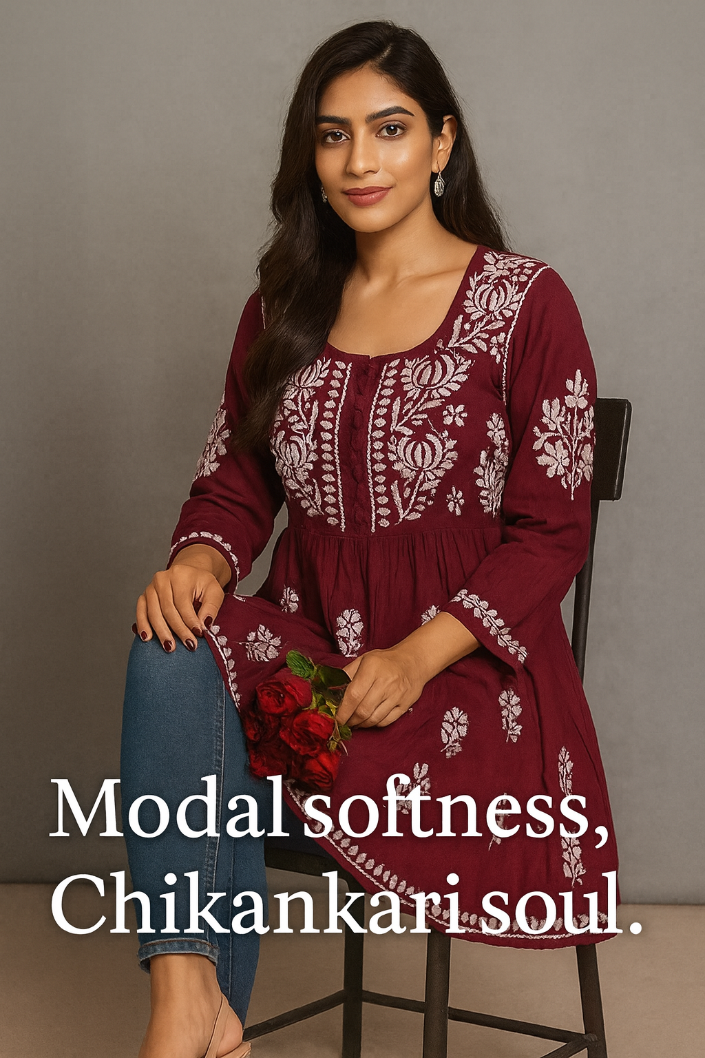 Lucknowi Chikankari Red 'Surkh' Georgette Kurti-K30013