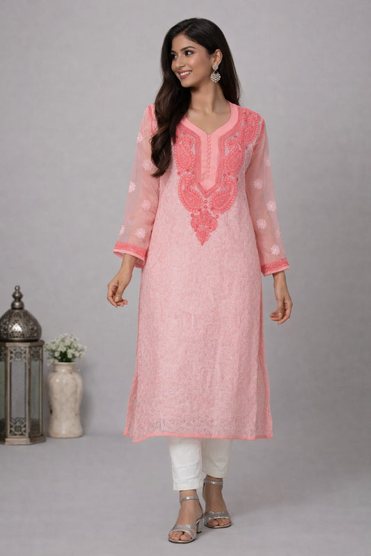 Lucknow Fashion Diary Hand Embroidered Lucknowi Chikankari Women's Coral Pink 'Shagufta' Georgette Kurta-K40041