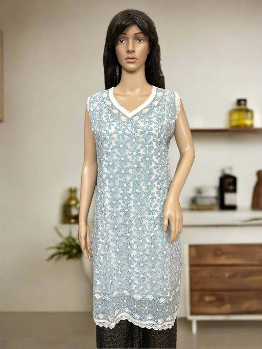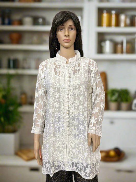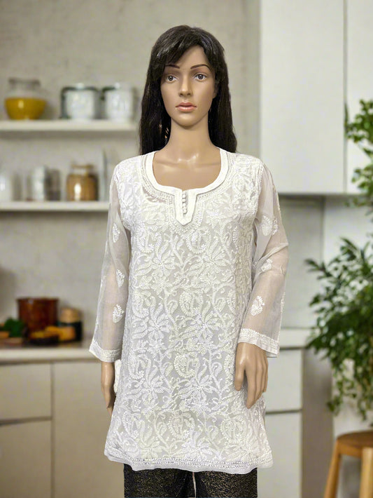 Lucknowi Chikankari White Georgette Short Kurti-T000058