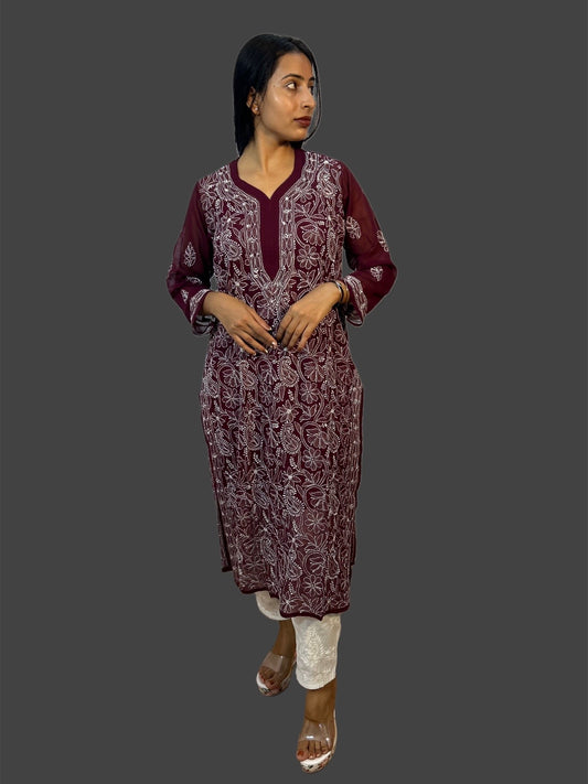 Lucknowi Chikankari Wine Georgette Kurti-K000039