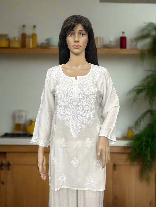 Lucknowi Chikankari White Modal Short Kurti-T50004