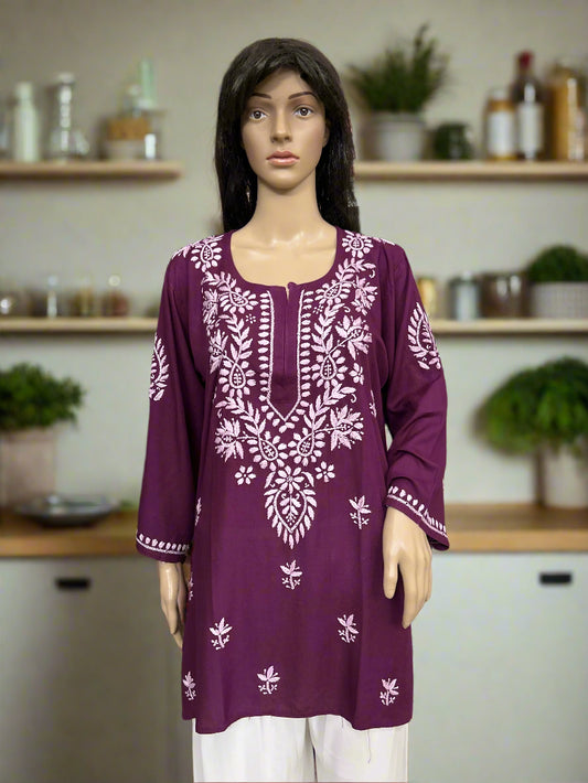 Lucknowi Chikankari Wine Rayon Short Kurti-T000065