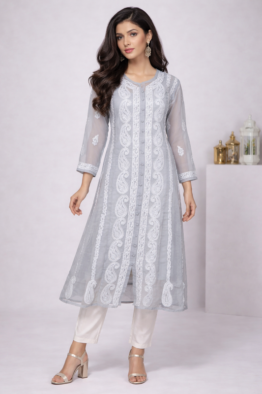 • Lucknow Chikankari Grey 'Dhoondhla' Georgette A-Line Kurti-K30058