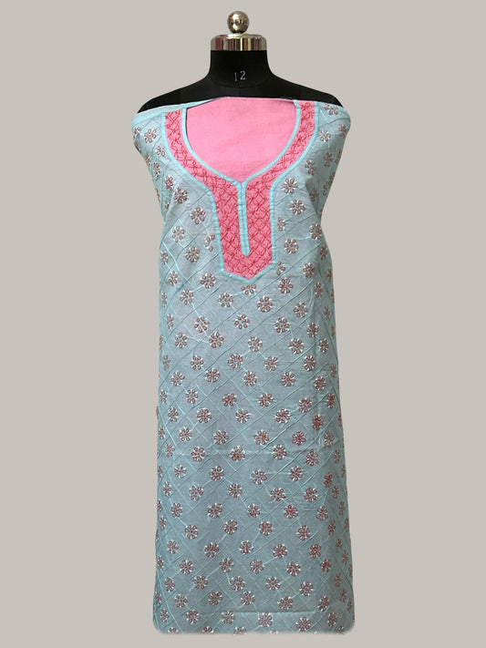 Lucknowi Chikankari Unstitched Blue Cotton Kurta-Bottom-Dupatta Fabric-U30005