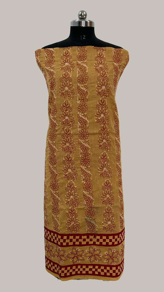 Lucknowi Chikankari Unstitched Fawn Cotton Kurta-Bottom-Dupatta Fabric-U30001