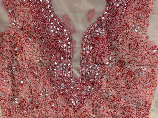Lucknowi Chikankari Unstitched Red Georgette Kurta Fabric-PG100020