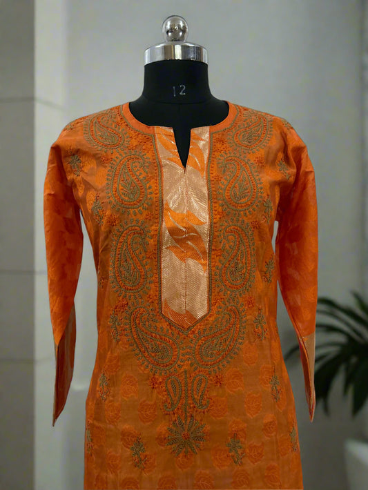 Lucknowi Chikankari Orange Chanderi Kurti-PE00009