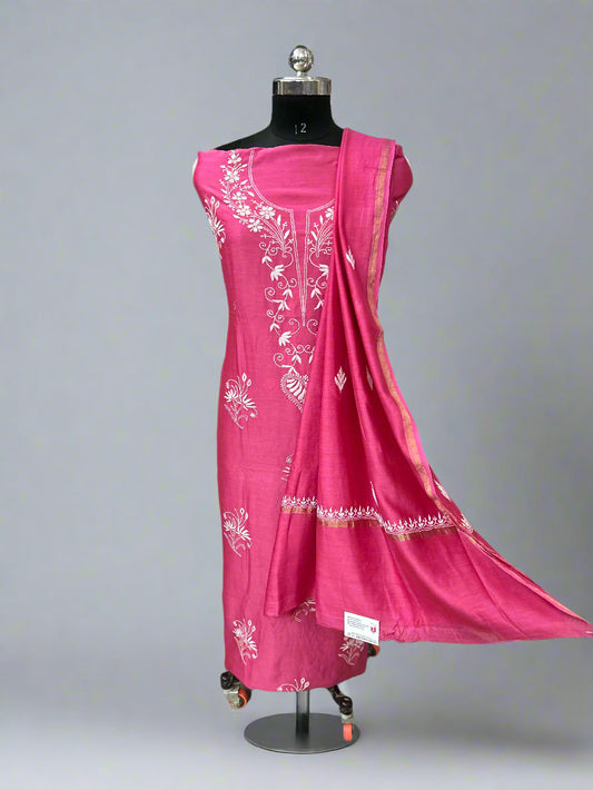 Lucknowi Chikankari Unstitched Dark Pink Chanderi Kurta-Dupatta Fabric-PG400052