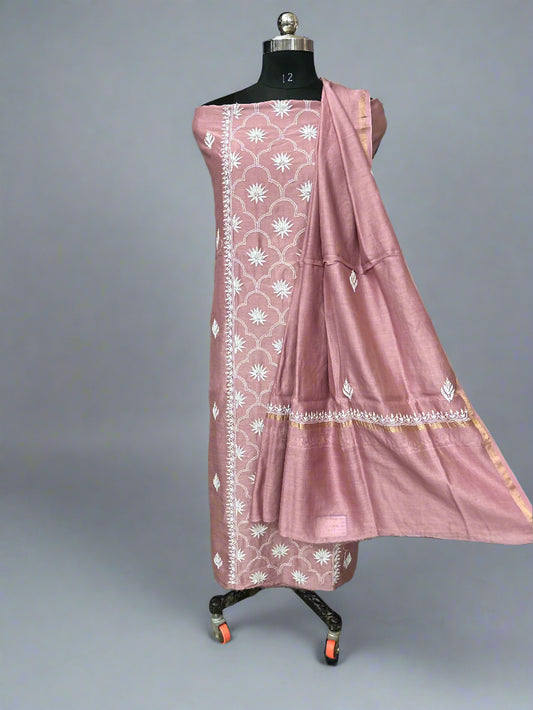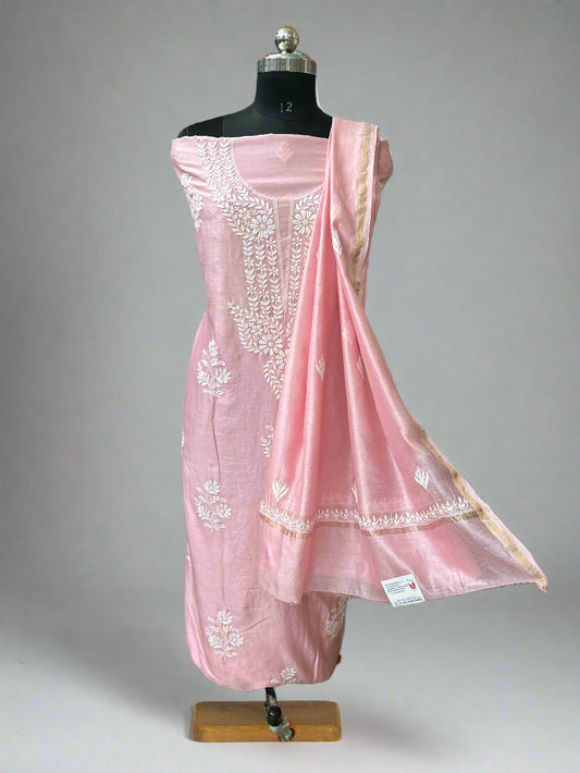 Lucknowi Chikankari Unstitched Pink Chanderi Kurta-Dupatta Fabric-PG400056