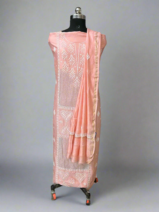 Lucknowi Chikankari Unstitched Peach Chanderi Kurta-Dupatta Fabric-PG400048
