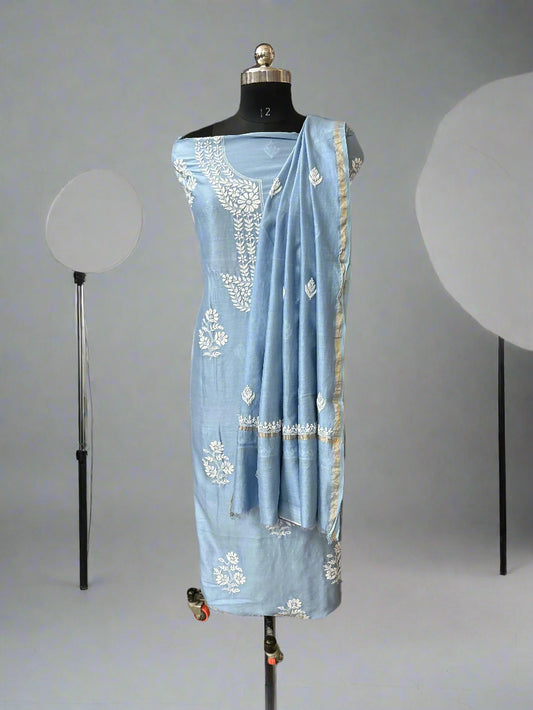 New Arrivals Popular TrendingLucknowi Chikankari Unstitched Blue Chanderi Kurta-Dupatta Fabric-PG400054