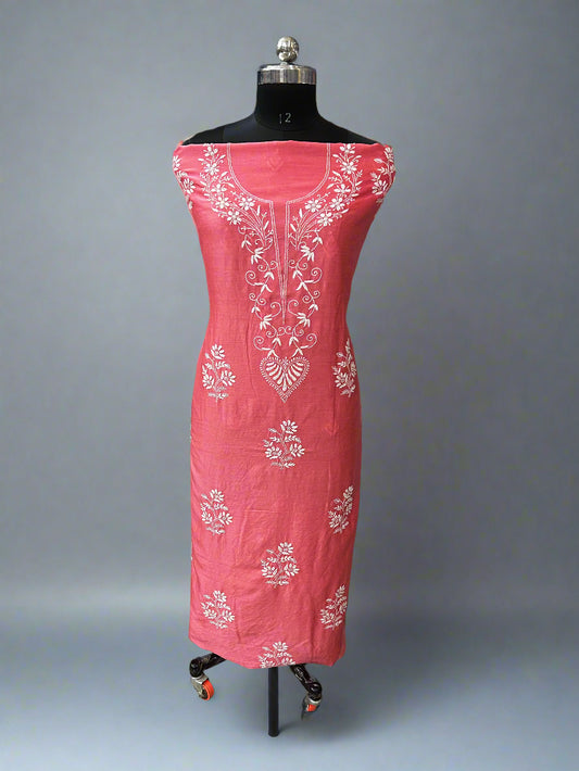 New Arrivals Popular TrendingLucknowi Chikankari Unstitched Coral Pink Chanderi Kurta-Dupatta Fabric-PG400059