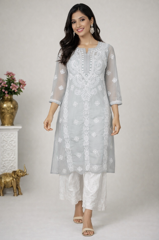 Lucknowi Chikankari Grey 'Dhoondhla' Georgette Kurti-K20003