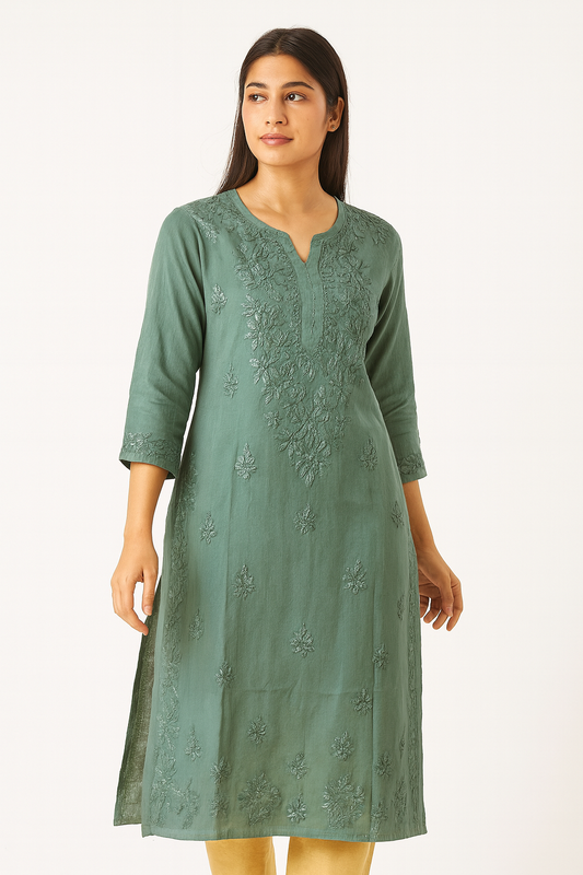 Lucknowi Chikankari Green 'Bahar' Cotton Kurti-K000184