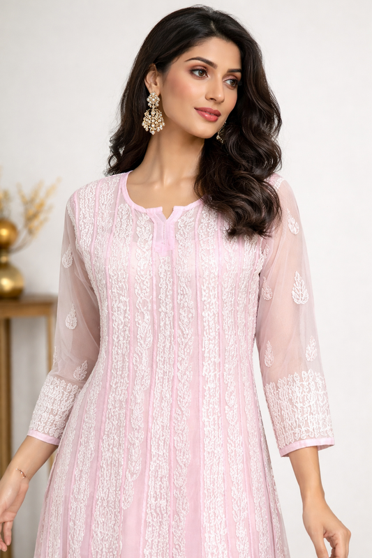 Lucknowi Chikankari Pink 'Shagufta' Georgette Kurti-K30016