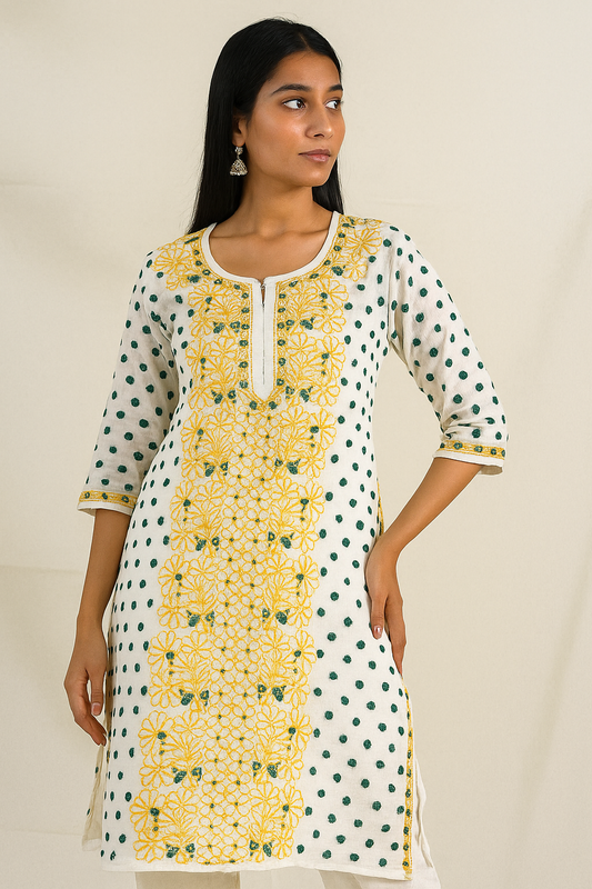 Lucknowi Chikankari Green 'Bahar' Cotton Kurti-K000184