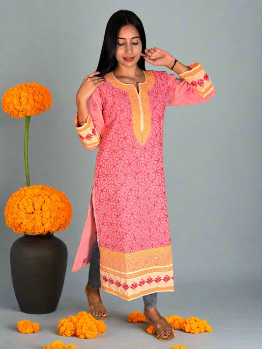 Lucknowi Chikankari Pink Cotton Kurti-K000001