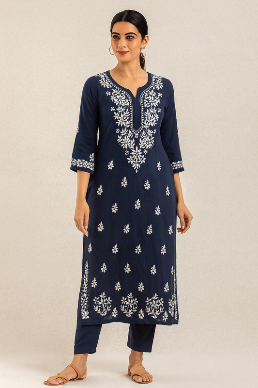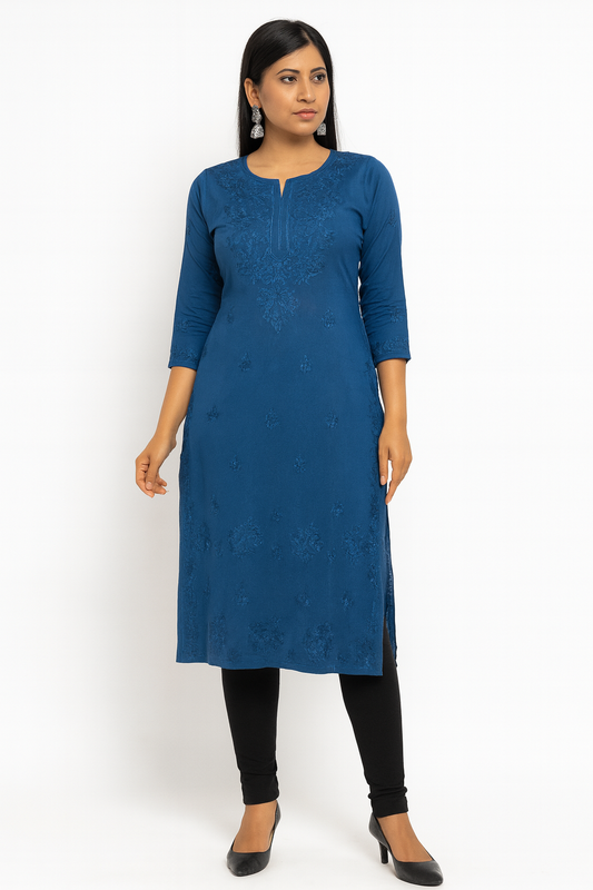 Lucknowi Chikankari Navy Blue 'Aab-e-Asmaan' Modal Kurti-K40092