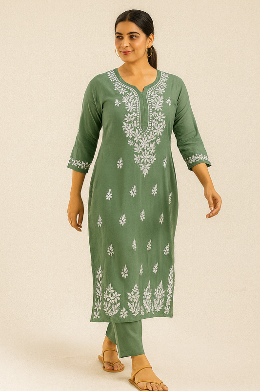 Lucknowi Chikankari Olive Green 'Bahar' Modal Kurti-K60056