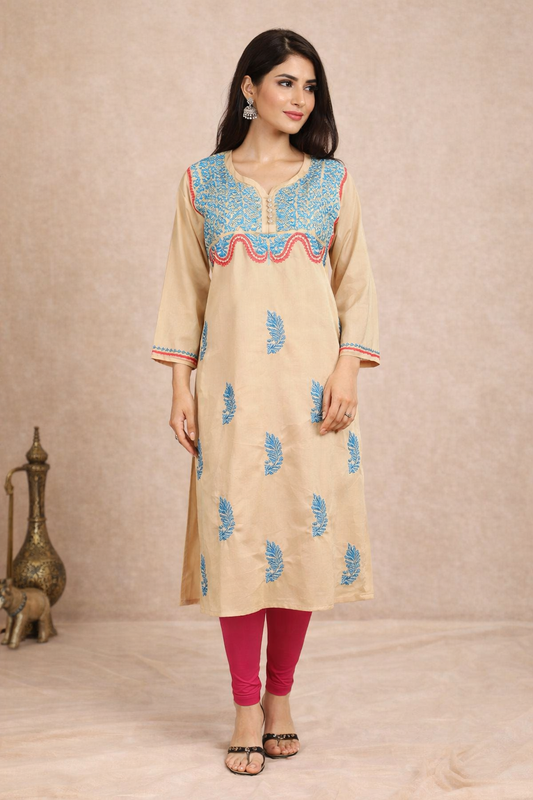 Lucknow Fashion Diary Hand Embroidered Lucknowi Chikankari Women's Fawn 'Karimi' Cotton Kurta-K50015