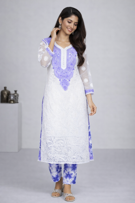 Lucknow Fashion Diary Hand Embroidered Lucknowi Chikankari Women's White 'Ujaala' Georgette Kurta-K50014