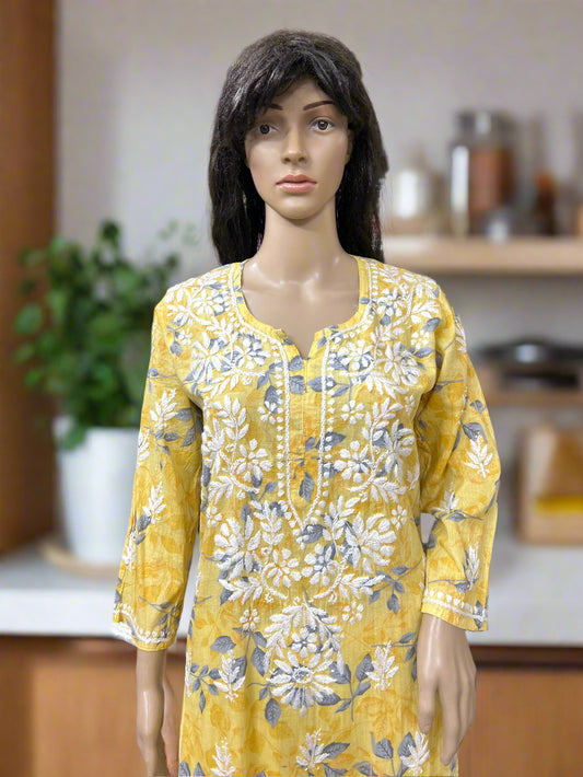 Lucknowi Chikankari Yellow Printed Cotton Kurti-K000179