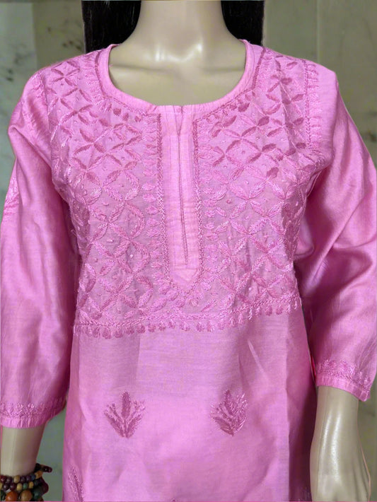 Lucknowi Chikankari Pink Chanderi Kurti-K000173