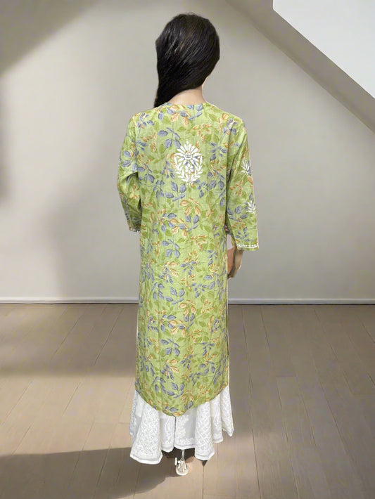 Lucknowi Chikankari Green Printed Cotton Kurti-K000175