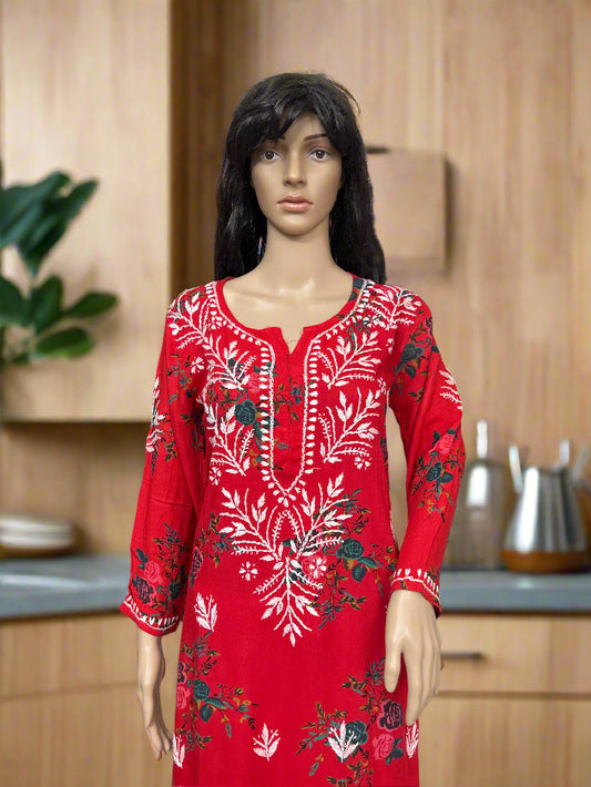 Lucknowi Chikankari Red Printed Rayon Kurti-K000074