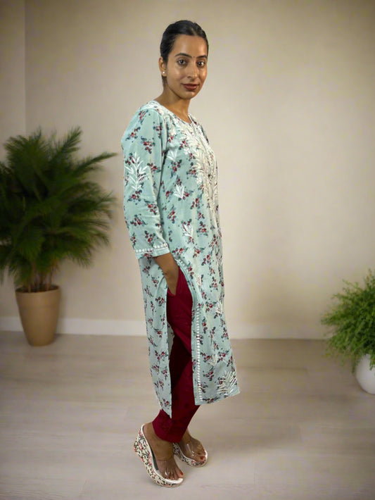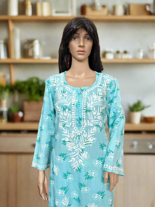 Lucknowi Chikankari Blue Printed Rayon Kurti-K000075