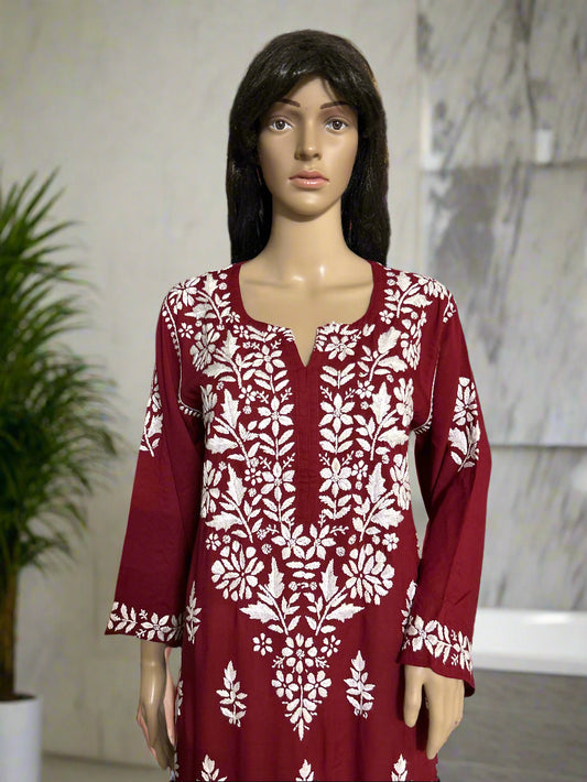 Lucknowi Chikankari Maroon Modal Kurti-K50077