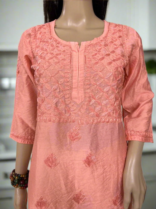 Lucknowi Chikankari Peach Chanderi Short Kurti-T000022
