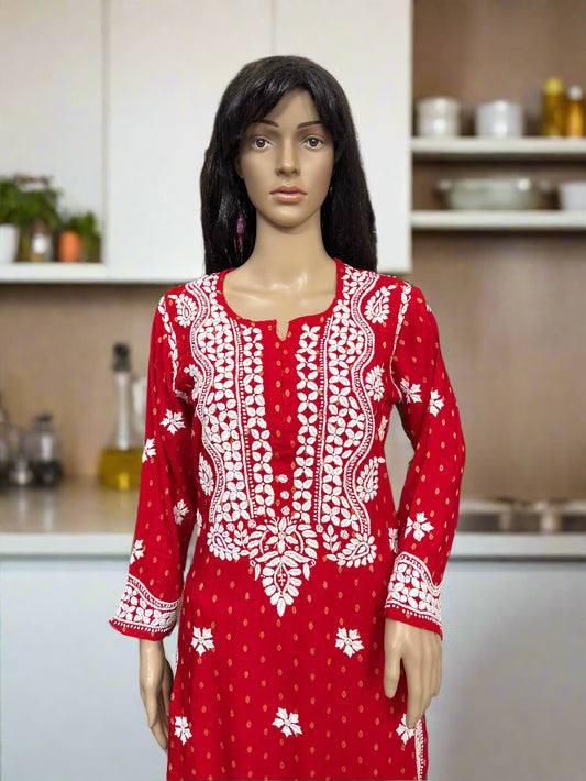 Lucknowi Chikankari Red Rayon Kurti-K20008