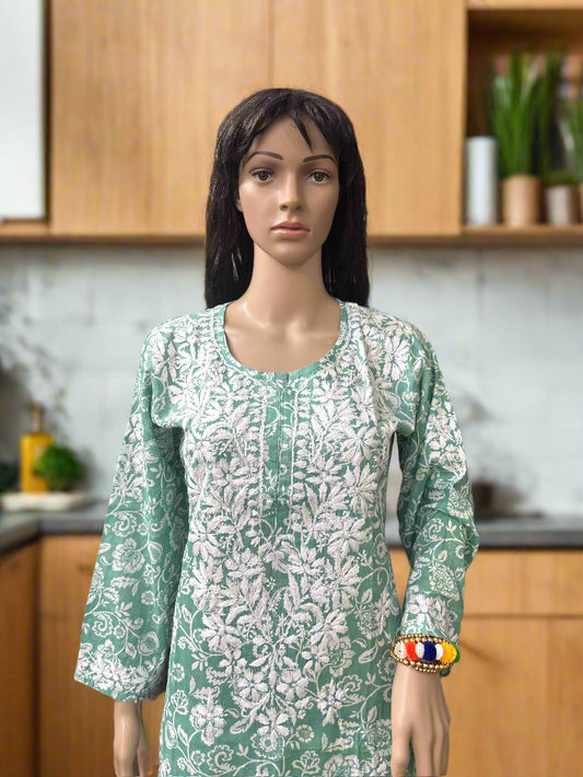 Lucknowi Chikankari Green Printed Cotton Kurti-K000080
