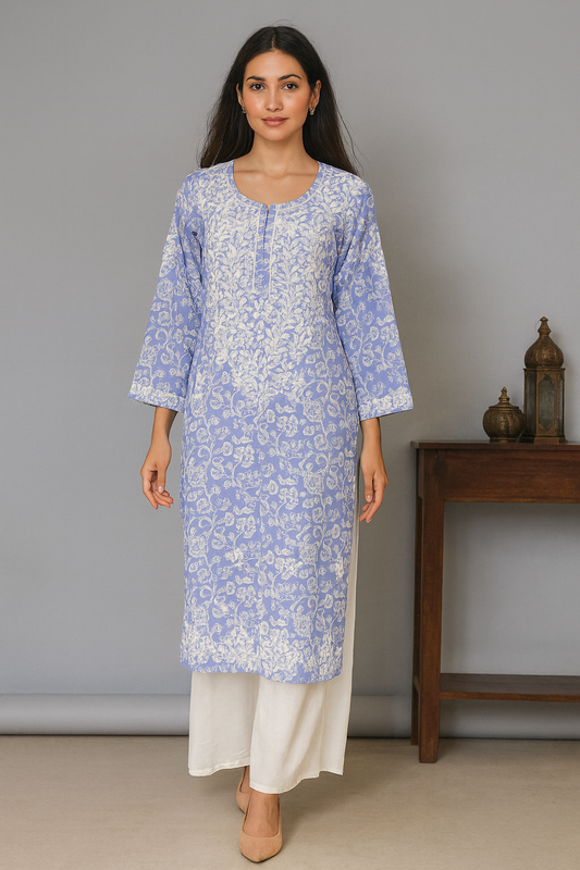Lucknowi Chikankari Blue Printed Cotton Kurti-K000079