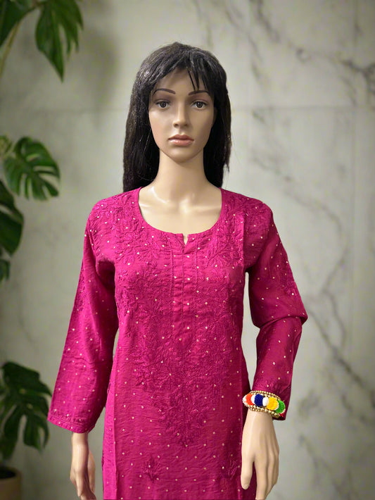 Lucknowi Chikankari Magenta Chanderi Kurti-K000036