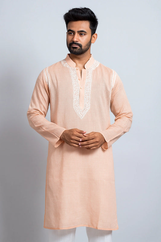 Lucknowi Chikankari Men's Peach 'Aarooi' Cotton Kurta