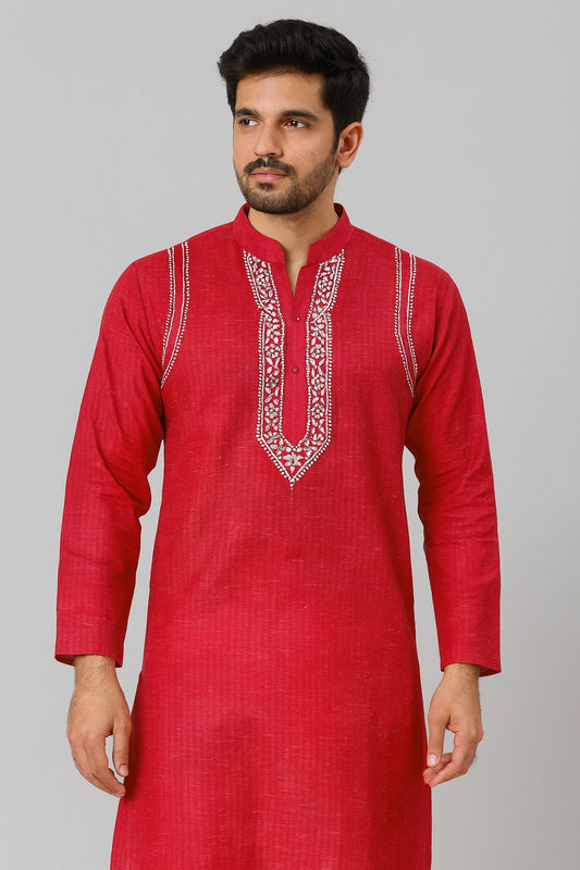 Lucknowi Chikankari Men's Red 'Surkh' Cotton Kurta