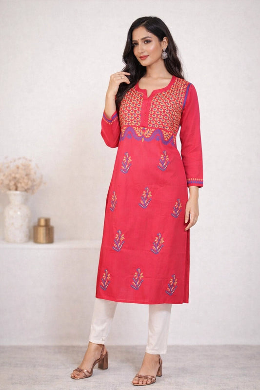 Lucknowi Chikankari Women's Coral Red 'Surkh' Cotton Kurta