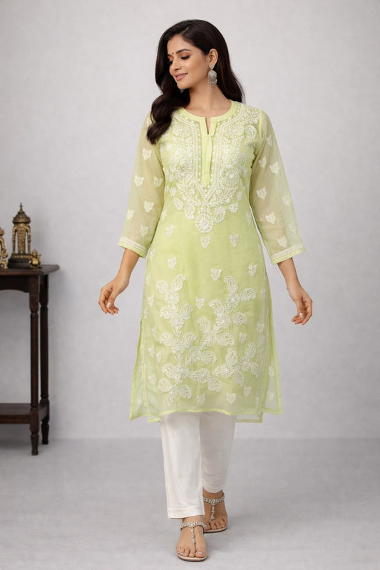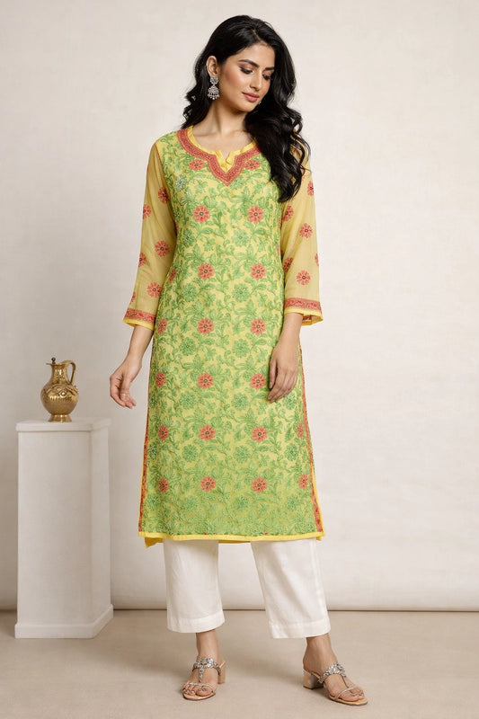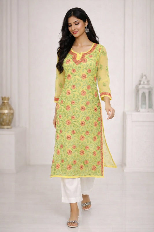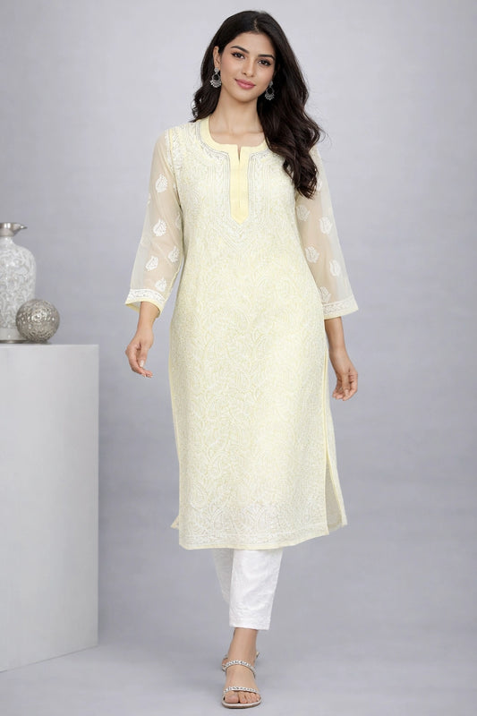 Lucknowi Chikankari Women's Yellow 'Sunehri' Georgette Kurta