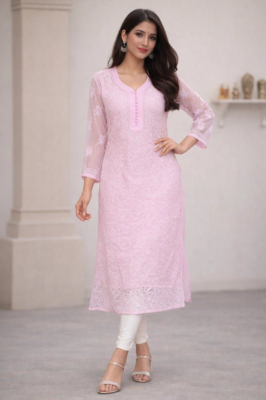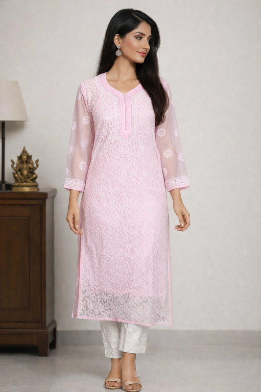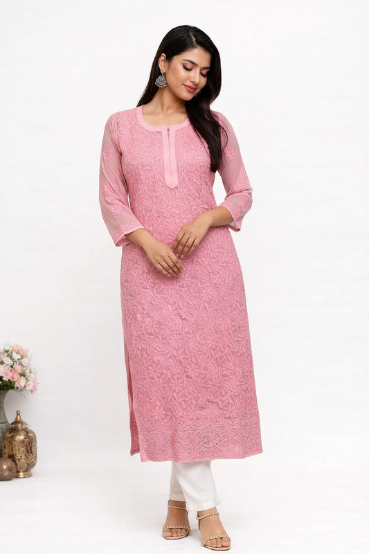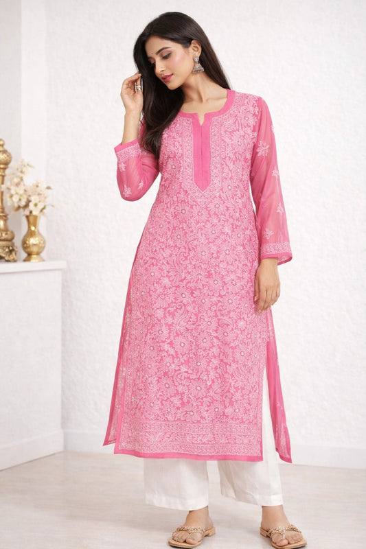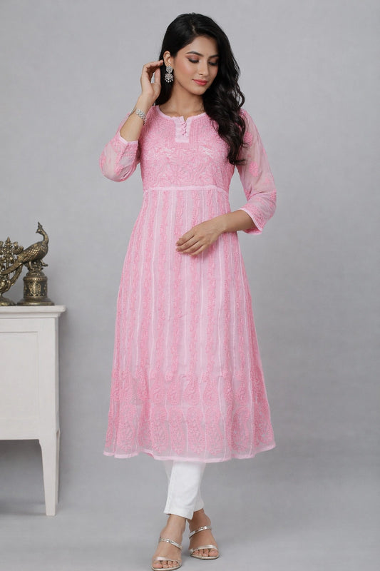 Lucknowi Chikankari Women's Pink 'Shagufta' Georgette Kurti