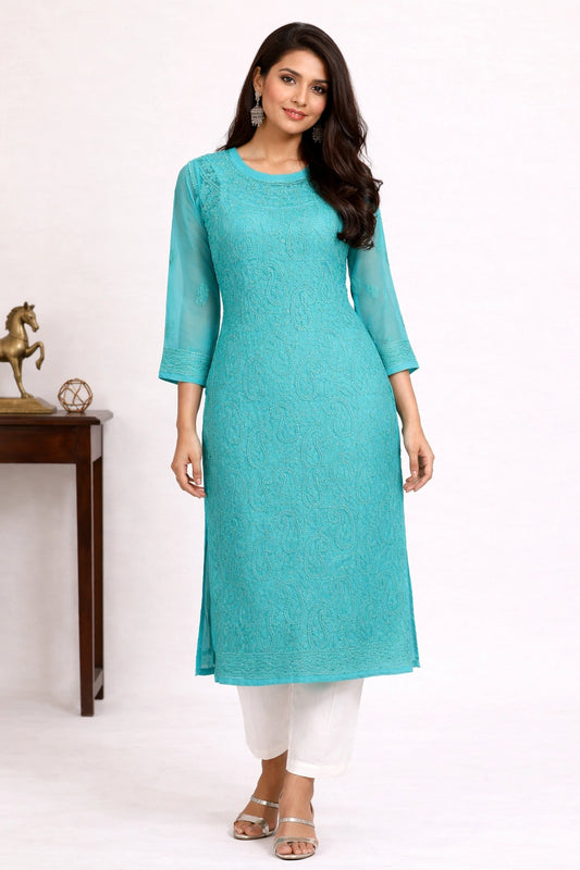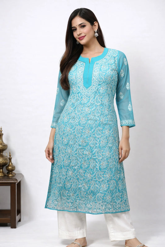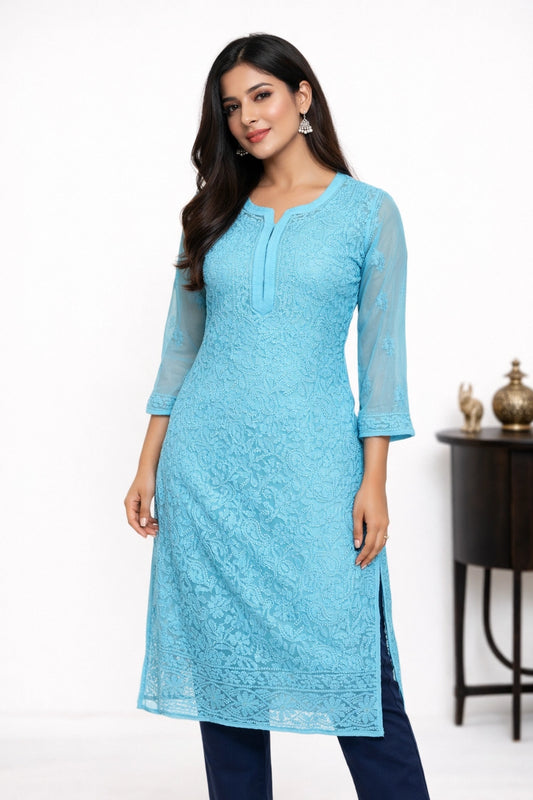 Lucknowi Chikankari Women's Blue 'Aab-e-Asmaan' Georgette Kurta