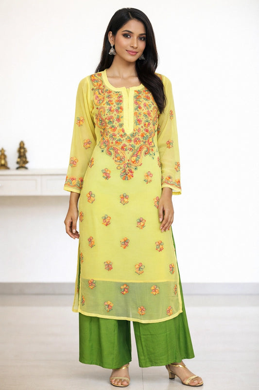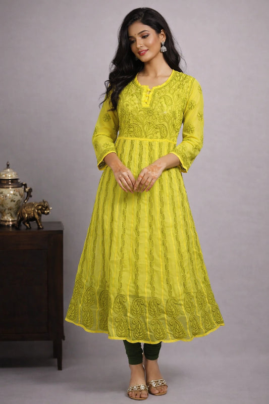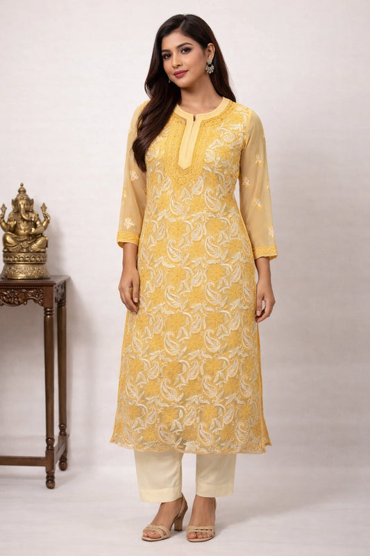 Lucknowi Chikankari Women's Yellow 'Sunehri' Georgette Kurta