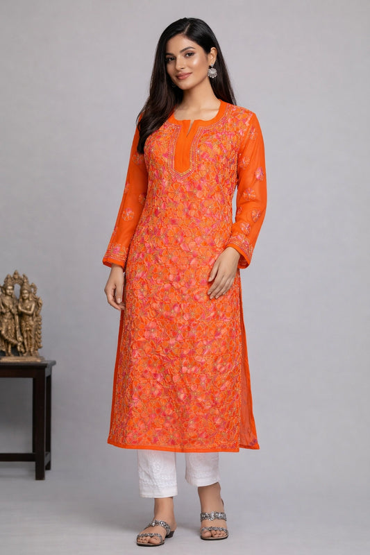 Lucknowi Chikankari Women's Orange 'Narangi' Georgette Kurta