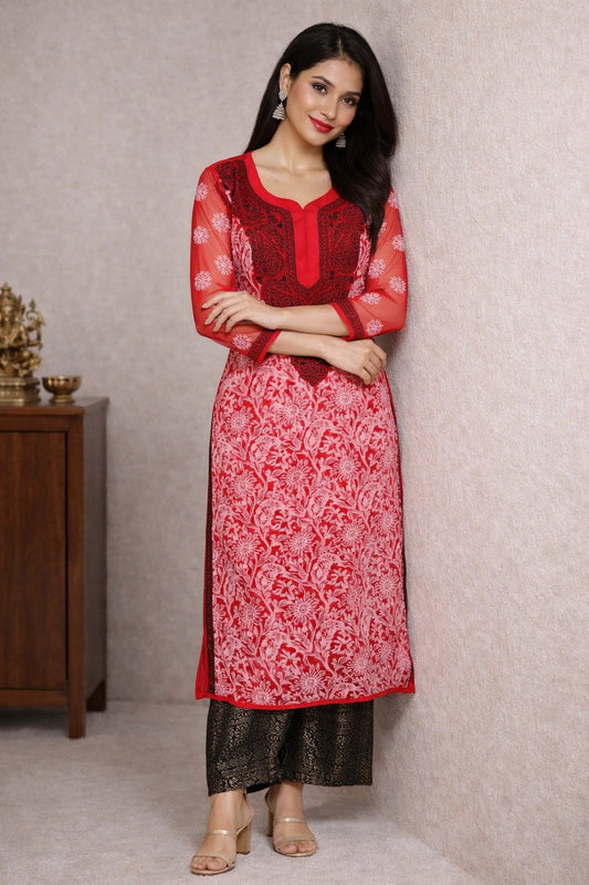 Lucknowi Chikankari Women's Red 'Surkh' Georgette Kurta
