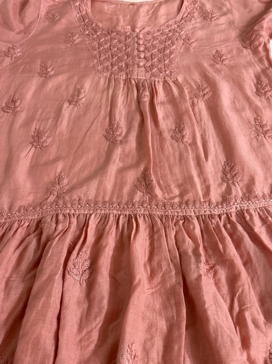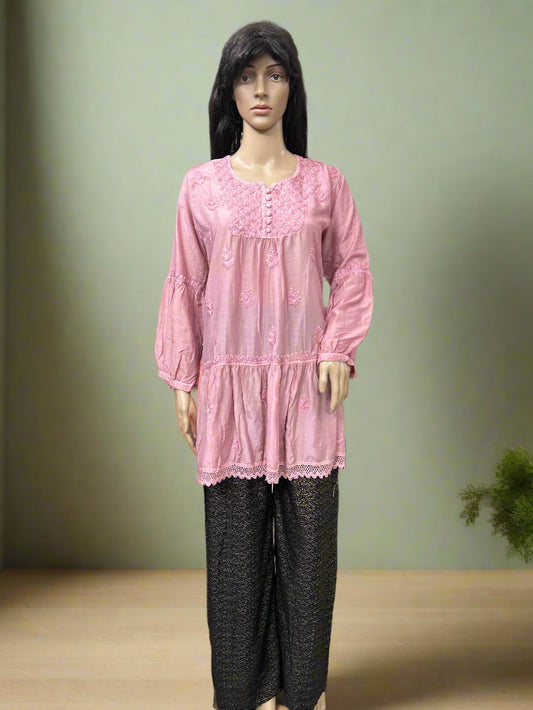 New ArrivalsLucknowi Chikankari Peach Muslin Short Kurti-T40015