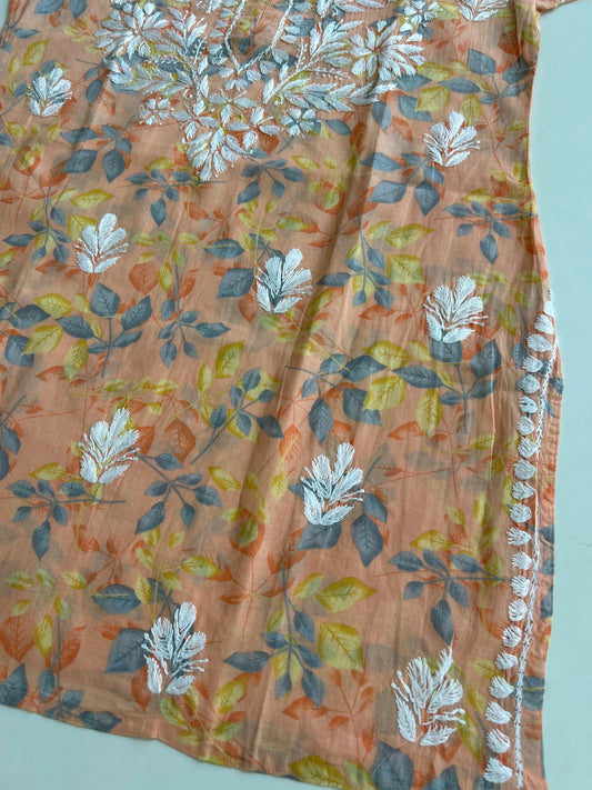 Lucknowi Chikankari Orange Printed Cotton Short Kurti-K000044