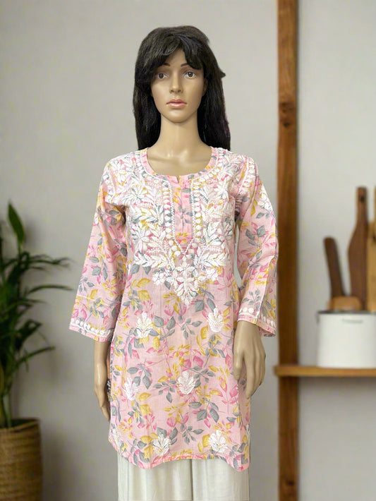 Lucknowi Chikankari Pink Printed Cotton Short Kurti-K000043